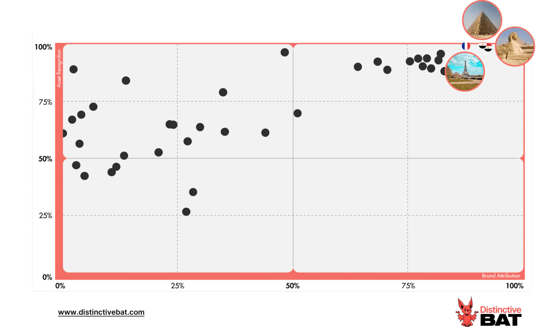 Furthermore, the study highlighted the enduring appeal of people and animals in tourism branding. Characters consistently perform well, emphasising the human propensity to remember faces over places or things. This is a common trend seen across other Distinctive BAT studies in all types of categories.