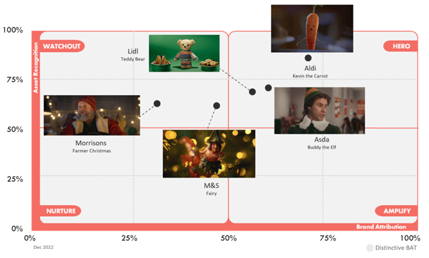 We recently tested the use of distinctive character assets in Christmas Advertising (see: Who Is The Most Distinctive Christmas Character In U.K. Retail?). Aldi’s Christmas Carrot was the pick of the crop, with 86% of people recognising “Kevin” as an asset from the retail category, and 70% able to correctly recall the asset as belonging to Aldi. This hero character was well embedded in multiple ways, not just in their seasonal advertising campaign, but with plush toys and dedicated social media channels.