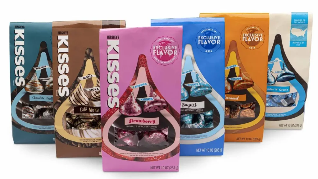 Hershey's Kisses capitalize on a distinctive product shape and extend this to their wider packaging. The repetition of this unique droplet shape becomes a hallmark of effective packaging, fostering instant Asset Recognition in the confectionery aisle. Use of material is also notable, with foil encasing the chocolate and a paper tag housing the brand logo.