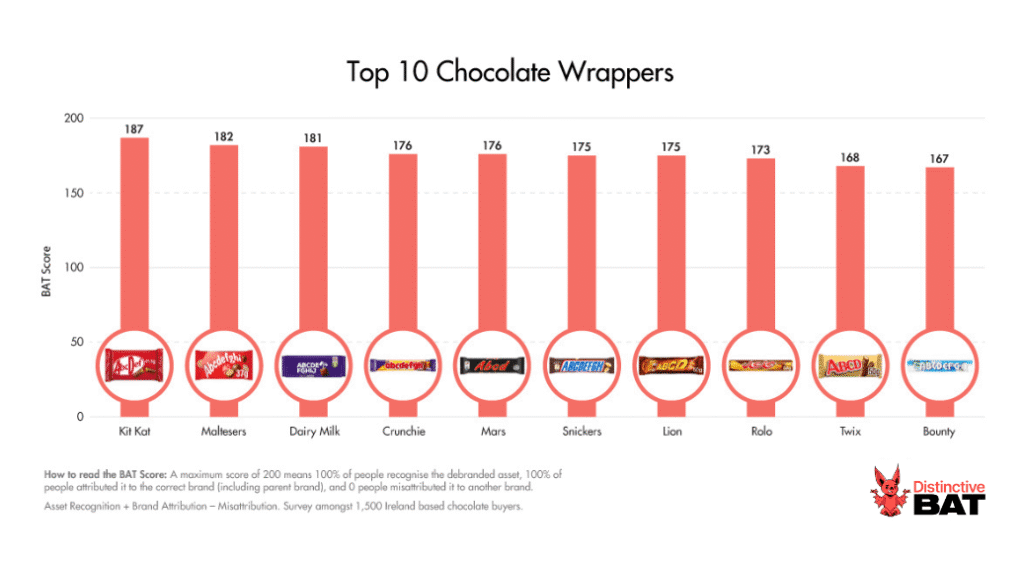 Kit Kat breaks out ahead of the competition with an impressive score of 187 out of a possible 200 - and while the top scoring Kit Kat and Maltesers packaging is visually similar, we will go on to see that it is the supplementary assets incorporated by the former which allow it to rank as the category leader.